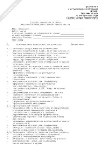 Хронометражная карта врача амбулаторно-консультативного приема центра профпатологии (рекомендуемый образец заполнения)