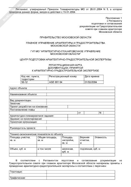Регистрационная карта документации, принятой к архитектурно-градостроительной экспертизе (рекомендуемый образец заполнения)