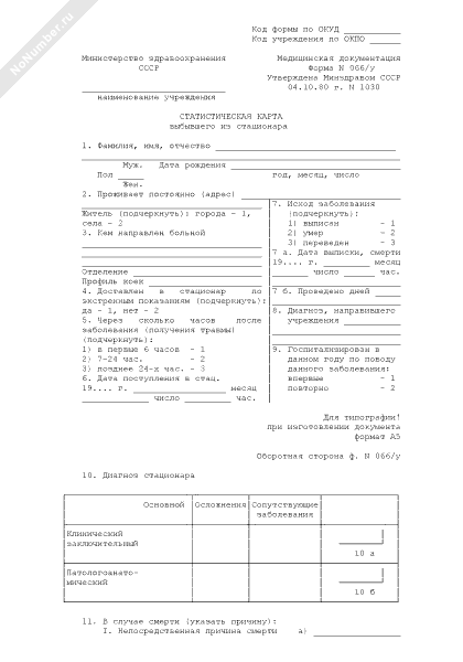 Статистическая карта выбывшего из стационара. Форма № 066/у (рекомендуемый образец заполнения)