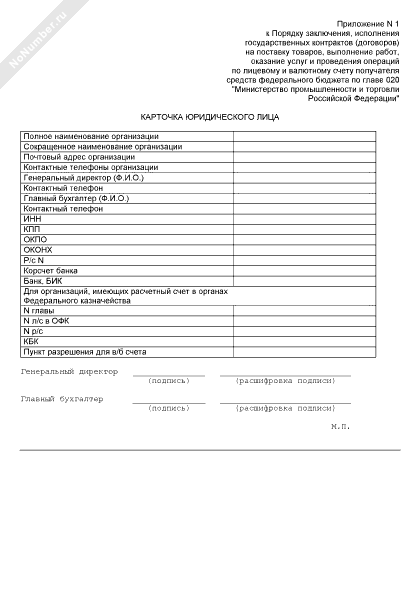 - 322Карточка юридического лица Исполнителя государственного контракта (договора) на поставку товаров, выполнение работ, оказание услуг и проведения операций по лицевому и валютному счету получателя средств федерального бюджета по главе 020 «Министерство промышленности и торговли Российской Федерации»