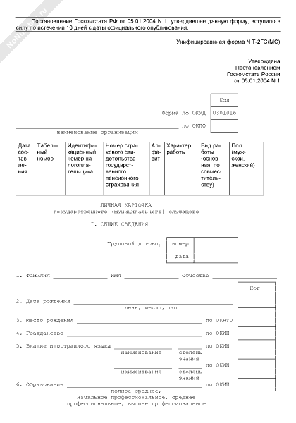 - 373Личная карточка государственного (муниципального) служащего. Унифицированная форма № Т-2ГС(МС)