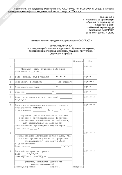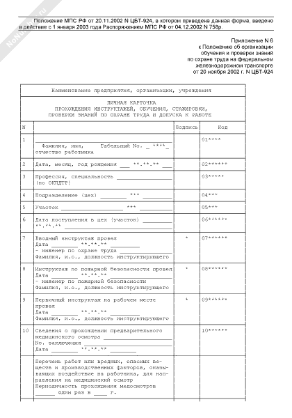 - 366Личная карточка прохождения инструктажей, обучения, стажировки, проверки знаний по охране труда и допуска к работе на федеральном железнодорожном транспорте