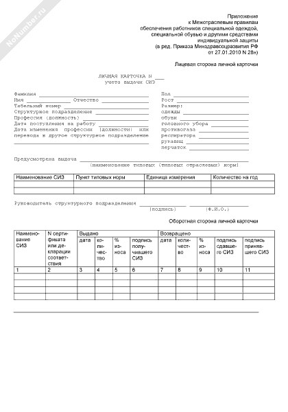 - 377Личная карточка учета выдачи средств индивидуальной защиты (СИЗ) работнику