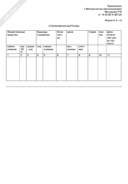 - 520Стеллажная карточка на каждую поступившую серию медицинских товаров для контроля реализации лекарственных средств по срокам годности. Форма № А-1.9