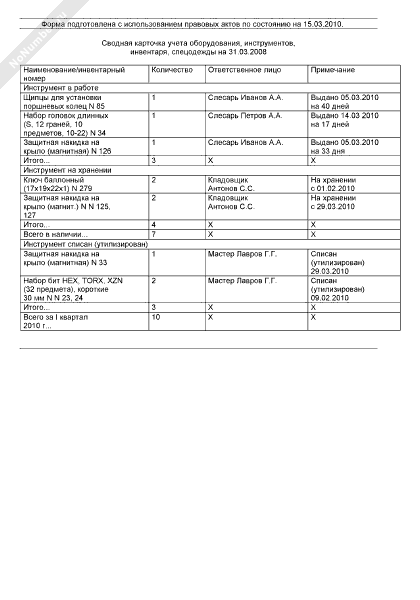 - 502Сводная карточка учета оборудования, инструментов, инвентаря, спецодежды