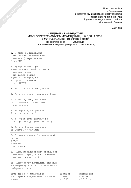 - 536Учетная карточка по объектам муниципальной собственности городского поселения Руза Московской области. Сведения об арендаторе (пользователе) объекта (помещения)