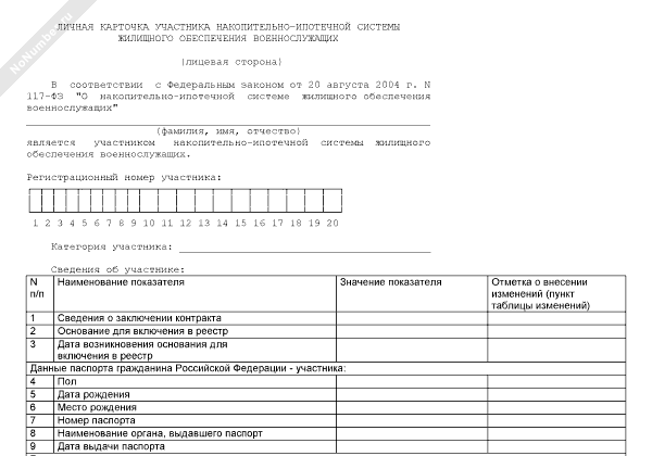 Формы документов, необходимых для формирования и ведения реестра участников накопительно-ипотечной системы жилищного обеспечения военнослужащих. Личная карточка участника накопительно-ипотечной системы жилищного обеспечения военнослужащих. Форма № 2/НИС (рекомендуемый образец заполнения)