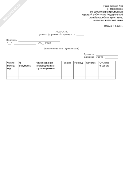 Формы учетных документов. Карточка учета форменной одежды территориального органа ФССП. Форма № 5-вещ (рекомендуемый образец заполнения)