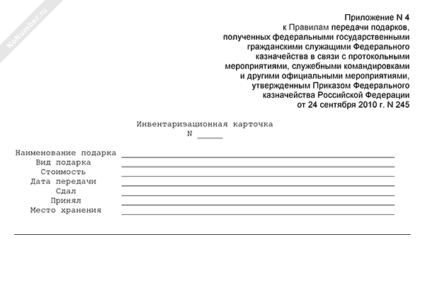 Инвентаризационная карточка подарка(ов), полученного федеральным государственным гражданским служащим Федерального казначейства в связи с протокольными мероприятиями, служебными командировками и другими официальными мероприятиями