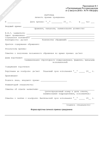 Карточка личного приема гражданина в Федеральной службе по надзору в сфере транспорта и ее территориальных органах (рекомендуемый образец заполнения)