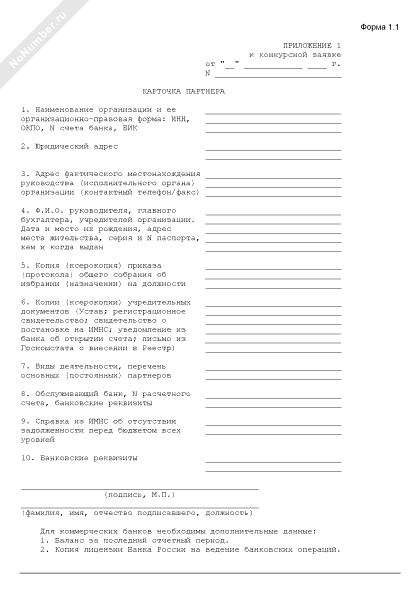 Карточка партнера. Форма № 1.1 (приложение к конкурсной заявке)