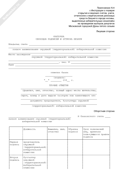 Карточка образцов подписей и оттиска печати владельца счета окружной (территориальной) избирательной комиссии города Москвы
