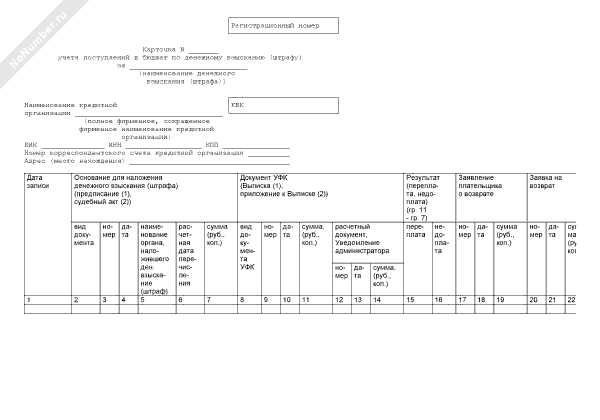 Карточка учета поступлений в бюджет по денежному взысканию (штрафу)