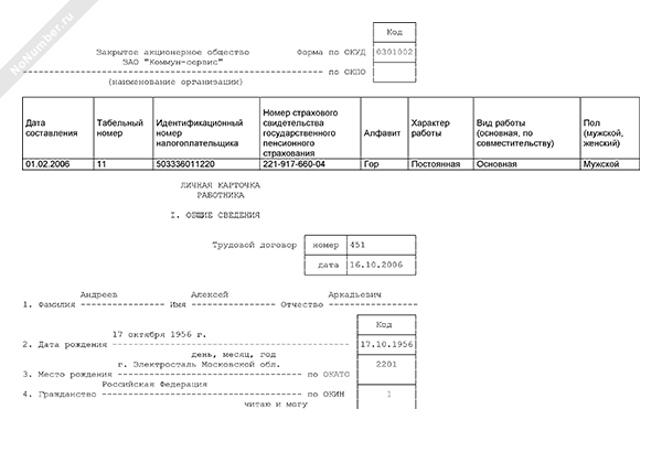 Личная карточка работника. Унифицированная форма № Т-2