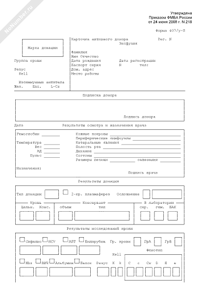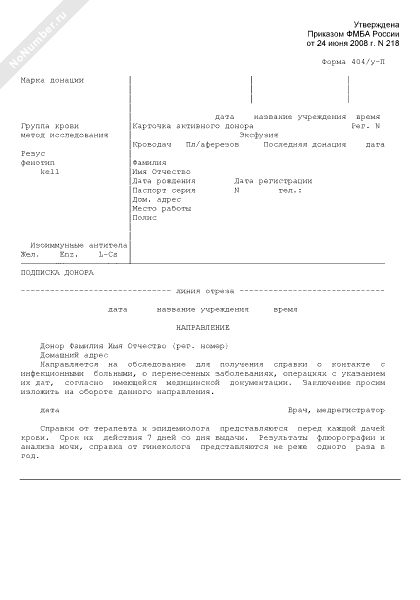 Одноразовая карточка первичного донора. Форма № 404/у-П