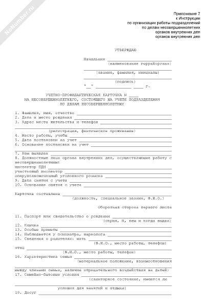 Учетно-профилактическая карточка на несовершеннолетнего, состоящего на учете подразделения по делам несовершеннолетних (рекомендуемый образец заполнения)
