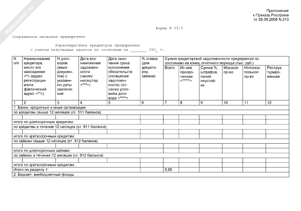 Характеристика кредиторов предприятия, находящегося в сфере ведения и координации Роспрома, с учетом полученных авансов. Форма № VI/5 (рекомендуемый образец заполнения)
