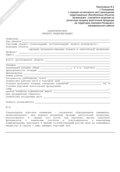 Характеристика объекта лицензирования на розничную продажу алкогольной продукции на территории Сергиево-Посадского муниципального района Московской области (рекомендуемый образец заполнения)