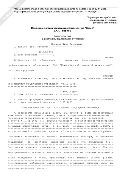Характеристика работника, подлежащего аттестации (рекомендуемый образец заполнения)