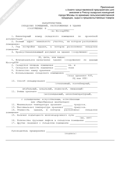 Характеристика складских помещений, расположенных в здании (сооружении) (приложение к анкете представляемой предприятием для внесения в реестр складских помещений города Москвы по хранению сельскохозяйственной продукции, сырья и продовольственных товаров)