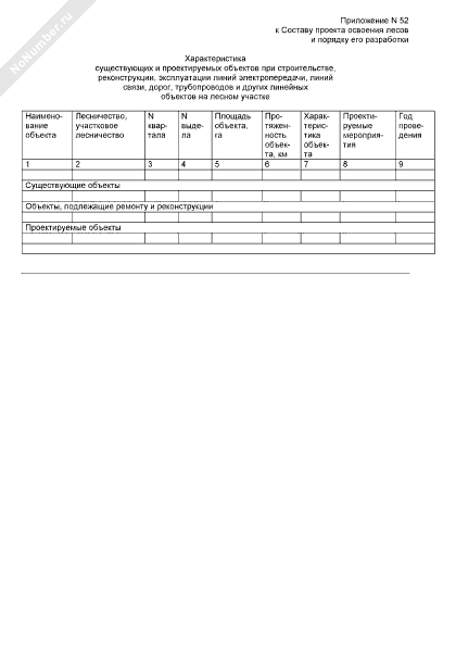 Характеристика существующих и проектируемых объектов при строительстве, реконструкции, эксплуатации линий электропередачи, линий связи, дорог, трубопроводов и других линейных объектов на лесном участке (рекомендуемый образец заполнения)