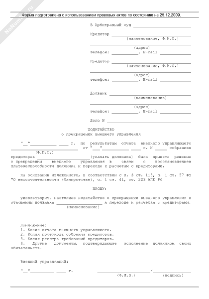 - 214Ходатайство о прекращении внешнего управления в связи с восстановлением платежеспособности должника и переходе к расчетам с кредиторами
