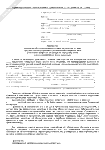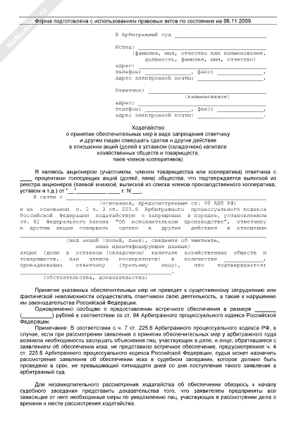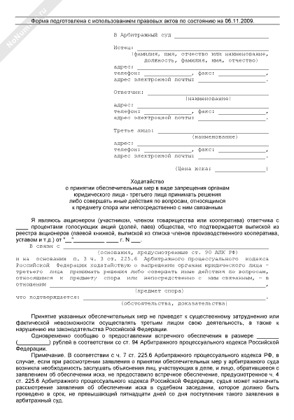 - 204Ходатайство о принятии обеспечительных мер в виде запрещения ответчику и другим лицам совершать сделки и другие действия в отношении акций, долей в уставном (складочном) капитале хозяйственных обществ и товариществ, паев членов кооперативов
