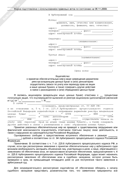 - 208Ходатайство о принятии обеспечительных мер в виде запрещения держателю реестра владельцев ценных бумаг и (или) депозитарию осуществлять записи по учету или переходу прав на акции и иные ценные бумаги, а также совершать другие действия в связи с размещением и (или) обращением ценных бумаг