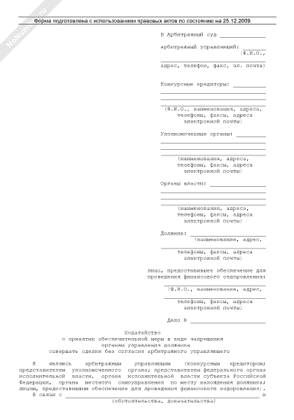 - 210Ходатайство о принятии после введения наблюдения обеспечительной меры в виде запрещения органам управления должника совершать сделки без согласия арбитражного управляющего