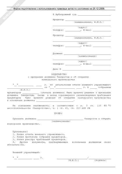 - 215Ходатайство о признании должника банкротом и об открытии конкурсного производства