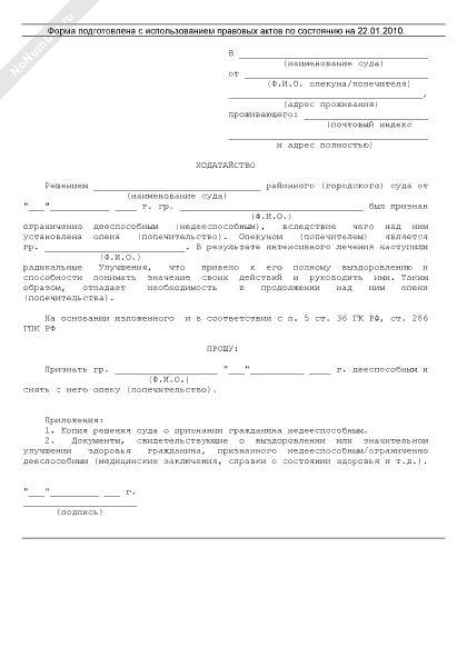 - 212Ходатайство о признании подопечного дееспособным и о снятии с него опеки или попечительства