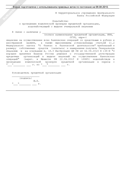 - 218Ходатайство о проведении комплексной проверки кредитной организации, ходатайствующей о выдаче генеральной лицензии