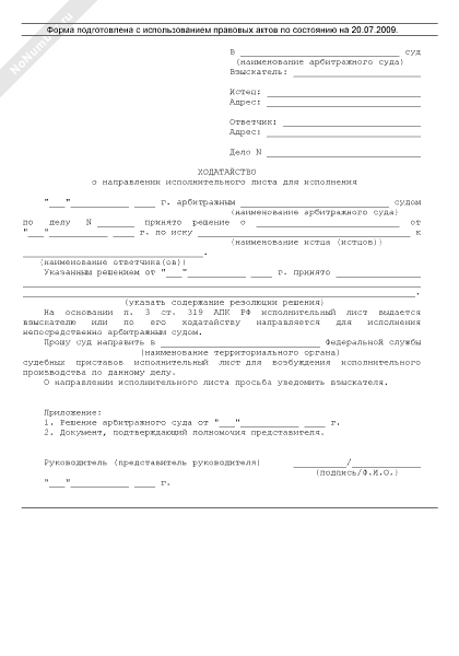 Ходатайство в арбитражный суд о выдаче исполнительного листа на принудительное исполнение мирового соглашения (рекомендуемый образец заполнения)