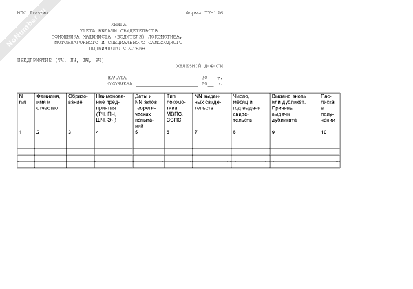 - 222Книга учета выдачи свидетельств помощника машиниста (водителя) локомотива, мотор-вагонного и специального самоходного подвижного состава. Форма № ТУ-146