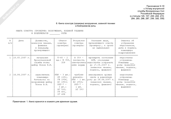 - 465Формы документов, ведущихся в роте. Книга осмотра (проверки) вооружения, военной техники и боеприпасов роты