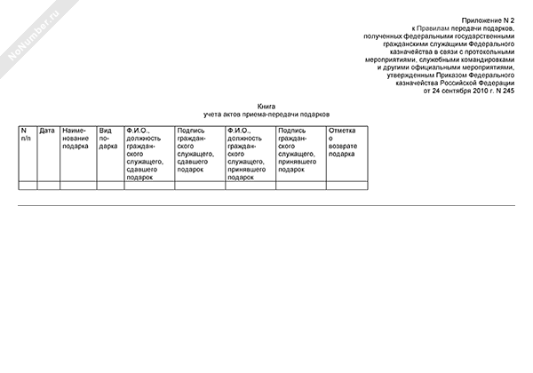 - 478Книга учета актов приема-передачи подарков, полученных федеральными государственными гражданскими служащими Федерального казначейства в связи с протокольными мероприятиями, служебными командировками и другими официальными мероприятиями, утвержденным Приказом Федерального казначейства Российской Федерации