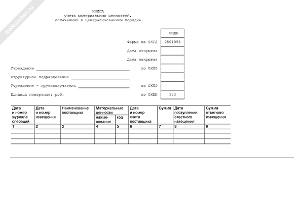 Книга учета материальных ценностей, оплаченных в централизованном порядке