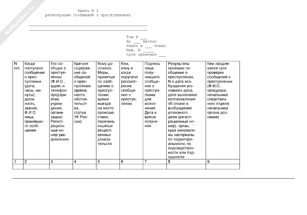 - 155Книга регистрации сообщений о преступлениях в органах Федеральной службы безопасности приема, регистрации и проверки сообщений о преступлениях и иной информации о преступлениях и событиях, угрожающих личной и общественной безопасности