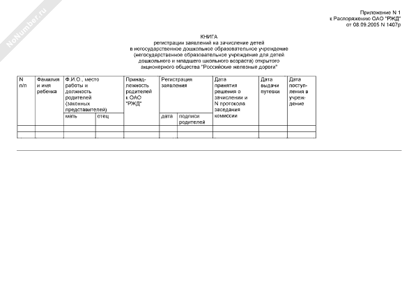 - 144Книга регистрации заявлений на зачисление детей в негосударственное дошкольное образовательное учреждение (негосударственное образовательное учреждение для детей дошкольного и младшего школьного возраста) открытого акционерного общества «Российские железные дороги»