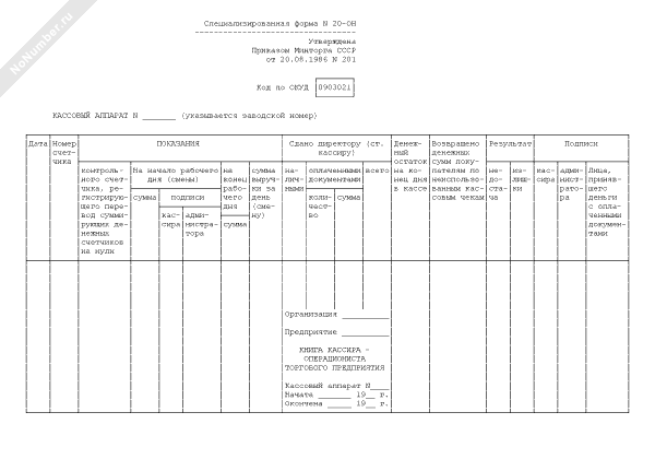 Книга кассира-операциониста торгового предприятия. Специализированная форма № 20-ОН (рекомендуемый образец заполнения)
