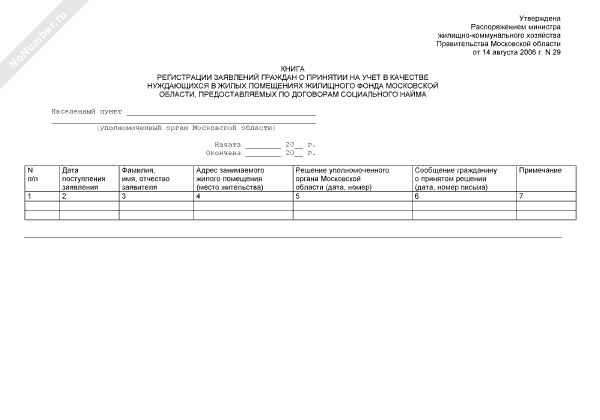 Книга регистрации заявлений граждан о принятии на учет в качестве нуждающихся в жилых помещениях жилищного фонда Московской области, предоставляемых по договорам социального найма (рекомендуемый образец заполнения)