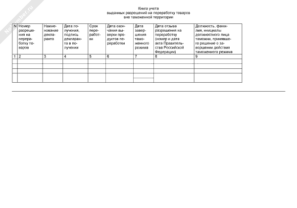 Книга учета выданных разрешений на переработку товаров вне таможенной территории (рекомендуемый образец заполнения)