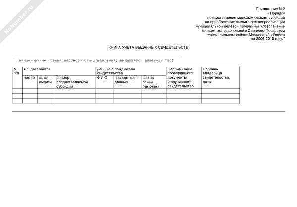 Книга учета выданных свидетельств в рамках реализации муниципальной целевой программы «Обеспечение жильем молодых семей в Сергиево-Посадском муниципальном районе Московской области на 2006-2010 годы» (рекомендуемый образец заполнения)