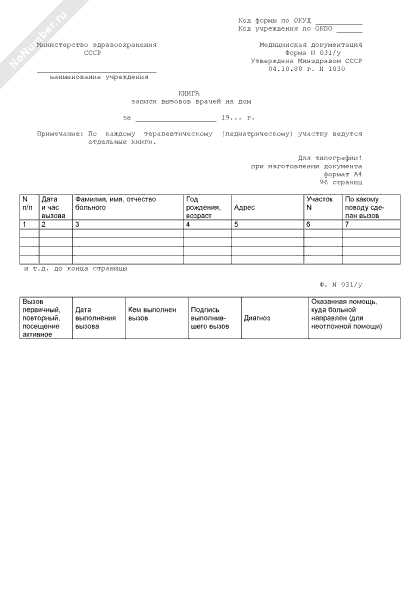 Книга записи вызова врачей на дом. Форма № 031/у