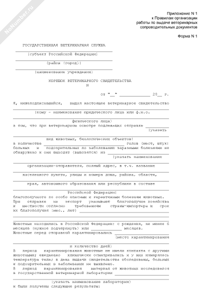 - 6Корешок ветеринарного свидетельства на животных (биологические объекты) при перевозке грузов за пределы района (города) по территории Российской Федерации (форма № 1)