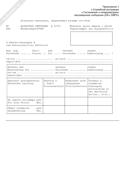 - 4Доплатная квитанция, оформляемая ручным способом. Серия Д 02001 (международное пассажирское сообщение) (рус./нем.)