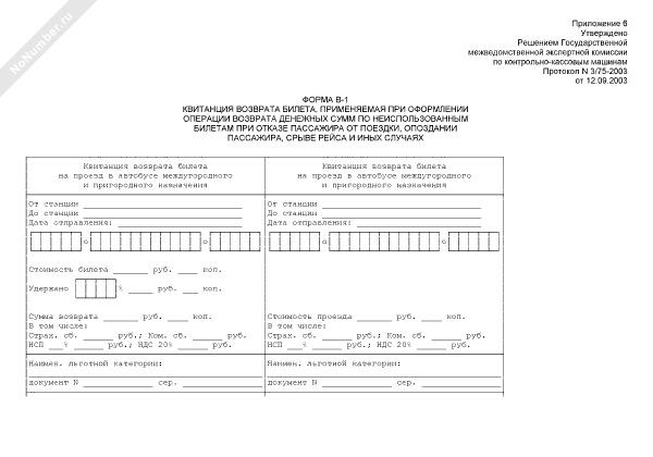 - 14Квитанция возврата билета, применяемая при оформлении операции возврата денежных сумм по неиспользованным билетам при отказе пассажира от поездки, опоздании пассажира, срыве рейса и иных случаях. Форма № В-1