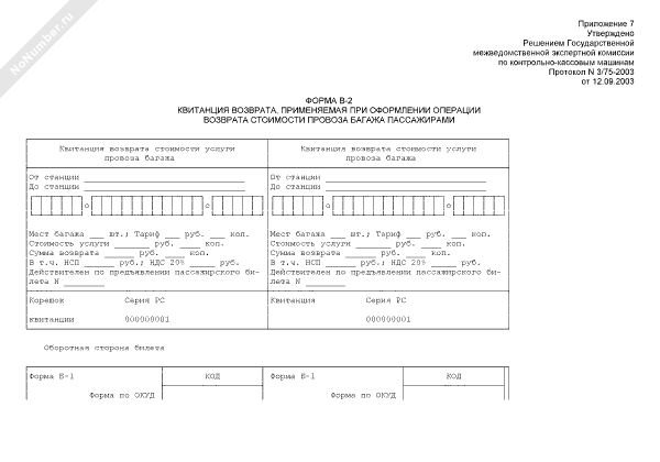 - 15Квитанция возврата, применяемая при оформлении операции возврата стоимости провоза багажа пассажирами. Форма № В-2