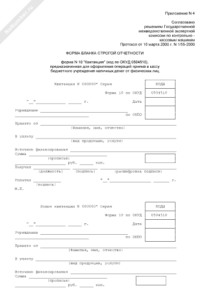 Квитанция, предназначенная для оформления операций приема в кассу бюджетного учреждения наличных денег от физических лиц (форма № 10)
