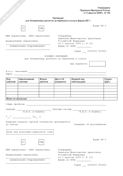 Квитанция для безналичных расчетов за перевозки и услуги. Форма № БР-1 (рекомендуемый образец заполнения)